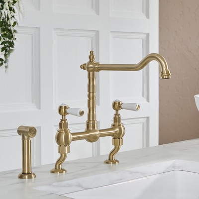 Die zauberhafte Brückenarmatur aus der Elizabeth Kollektion in satiniertem Gold verleiht Ihrer Küche einen nostalgischen Charme und bietet Ihnen einen schwenkbaren Hahn sowie eine herausziehbare Spülbrause. Das Modell überzeugt mit einer unschlagbaren Kombination aus Form und Funktion – die praktische Spülbrause zum Herausziehen und der schwenkbare Hahn erleichtern den Abwasch, während das klassische Design durch das strapazierbare Finish in satiniertem Gold gekonnt in Szene gesetzt wird. Dank der Konstruktion aus massivem Messing können Sie sich zudem auf langlebige Haltbarkeit verlassen und hinzu kommen die Keramikgriffe zur mühelosem Regulierung des Wassers. Eigenschaften: Dimensionen: B 360mm x T 313mm x H 293mm Klassisches und elegantes Design – perfekt für traditionelle Kücheneinrichtungen Langlebige Konstruktion aus massivem Messing mit wasserfleckenresistentem Finish in satiniertem Gold Herausziehbare Spülbrause mit 1, 5m Schlauch Keramikgriffe ermöglichen mühelose Regulierung des Wass...