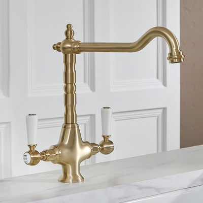 Die Elizabeth Küchenarmatur verleiht Ihrer Einrichtung einen Touch Klasse und Eleganz. Diese elegante Küchenarmatur ist in verschiedenen Farben erhältlich – Treffen Sie ganz einfach Ihre Auswahl aus den oben genannten Optionen. Das zeitlose Design wird durch das strapazierbare Finish gekonnt in Szene gesetzt und besteht dabei aus massivem Messing, um Ihnen langlebige Haltbarkeit gewährleisten zu können. Die Keramikgriffe ermöglichen eine mühelose Regulierung des Wassers, während die Keramikscheiben-Technologie die Bildung von Leckagen verhindert. Ergänzt wird das Modell durch den schwenkbaren Hahn