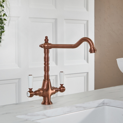 Die Elizabeth Küchenarmatur in satiniertem Kupfer verleiht Ihrer Einrichtung einen Touch Klasse und Eleganz. Das zeitlose Design wird durch das strapazierbare Finish in satiniertem Kupfer gekonnt in Szene gesetzt und besteht dabei aus massivem Messing, um Ihnen langlebige Haltbarkeit gewährleisten zu können. Die Keramikgriffe ermöglichen eine mühelose Regulierung des Wassers, während die Keramikscheiben-Technologie die Bildung von Leckagen verhindert. Ergänzt wird das Modell durch den schwenkbaren Hahn