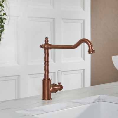 Die Küchenarmatur aus der Elizabeth Kollektion in satiniertem Kupfer ist eine zauberhafte Bereicherung für Ihren klassischen Einrichtungsstil. Sie umfasst einen Einhebelmischer und einen schwenkbaren Hahn. Das kunstvoll gestaltete Modell überzeugt mit einem eleganten Design aus massivem Messing, das langlebige Haltbarkeit verspricht und durch das strapazierbare Finish in satiniertem Kupfer in Szene gesetzt wird. Der Einhebelgriff ermöglicht dabei eine mühelose Regulierung des Wasserflusses und der Temperatur, während die integrierte Keramikkartuschen-Technologie die Bildung von Leckagen verhindert. Eigenschaften: Dimensionen: B 125mm x T 313mm x H 284mm Klassisches und elegantes Design Konstruktion aus massivem Messing mit strapazierbarem Finish in satiniertem Kupfer Keramikgriff ermöglicht mühelose Regulierung des Wasserflusses und der -temperatur Mit schwenkbarem Hahn (gerade) Mit Keramikscheiben-Technologie zur Vermeidung von Leckagen und Tröpfeln Anschluss: 2 x 1/2” Flexschläuche (Kalt/ War...