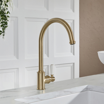 Die kunstvoll gestaltete Küchenarmatur in satiniertem Gold aus der Elizabeth Kollektion bereichert Ihre Einrichtung mit einem Hauch klassischer Eleganz. Sie umfasst einen Einhebelmischer und einen schwenkbaren Hahn. Dank der Konstruktion aus massivem Messing können Sie sich auf langlebige Haltbarkeit verlassen, während das wasserfleckenresistente Finish in satiniertem Gold für den letzten Schliff sorgt. Der einfach zu bedienende Hebelgriff ermöglicht dabei eine mühelose Regulierung des Wasserflusses und der Temperatur und hinzu kommt der praktische Hahn zum Schwenken. Eigenschaften: Dimensionen: B 125mm x T 259mm x H 368mm Klassisches und elegantes Design – perfekt für traditionelle Kücheneinrichtungen Langlebige Konstruktion aus massivem Messing mit wasserfleckenresistentem Finish in satiniertem Gold Keramikgriff ermöglicht mühelose Regulierung des Wasserflusses und der -temperatur Mit schwenkbarem Hahn (geschwungen) Mit Keramikscheiben-Technologie zur Vermeidung von Leckagen und Tröpfeln Ans...