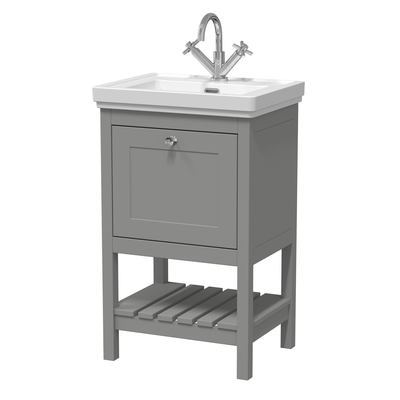 Verleihen Sie Ihrem Badezimmer mit diesem 530mm x 406mm Waschtischunterschrank in kühlem Grau inklusive Waschbecken mit einem Hahnloch und einem Möbelknauf in satiniertem Gold aus der Tudor-Kollektion einen charmanten Vintage-Stil. Dieses Modell bietet reichlich Platz, um Ihre Badartikel ordentlich zu verstauen, während das zauberhafte Design durch das Finish in kühlem Grau perfekt betont wird