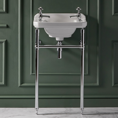 Bringen Sie mit dem wunderschön gestalteten traditionellen Richmond Becken (2 Hahnlöcher) 515mm inklusive Metallgestell in Chrom einen vintage-inspirierten Stil in Ihr Badezimmer. Das hochwertige Keramikwaschbecken verfügt über einen großen Waschraum und eine weiße Glasur, die strapazierfähig und pflegeleicht ist. Das Metallgestell zeichnet sich durch eine äußerst haltbare Oberfläche und ein elegantes Design aus, welches mit Sicherheit einen atemberaubenden Blickfang in Ihrem Badezimmer sein wird. In Verbindung mit einer passenden Elizabeth Armatur und anderen Artikeln der Kollektion ergibt sich ein atemberaubendes traditionelles Badezimmer und ein perfekt abgestimmtes Aussehen. Eigenschaften: Waschtisch in Komforthöhe – für mehr Komfort für größere Menschen und Personen mit eingeschränkter Mobilität Maximale Höhe 925 (einschließlich Becken) – der Waschtisch kann auf die gewünschte Höhe gekürzt werden Dimensionen: B 515mm x T 300mm Metallgestell in Chrom 2 Hahnlöcher Eingebauter Handtuchhalter W...