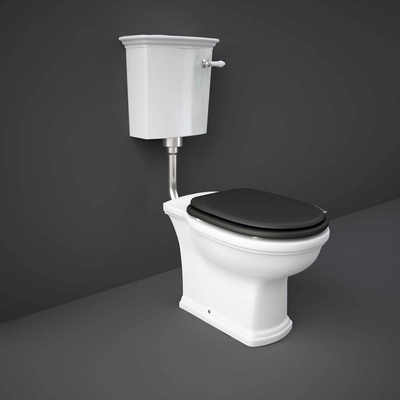 Kreieren Sie einen zeitlosen und eleganten Look mit der traditionellen RAK Washington St&-Toilette, inklusive erhöhtem Spülkasten und Soft-Close-Sitz in Schwarz. Nach höchsten Standards aus strapazierfähigem Kristallporzellan gefertigt, verfügt diese hochwertige Toilette über ein klassisches Design und verleiht Ihrem Badezimmer einen atemberaubenden Vintage-Look. Kombinieren Sie andere Artikel aus der RAK Washington-Kollektion für ein atemberaubendes Designer-Bad und einen perfekt abgestimmten Look. Eigenschaften: Dimensionen: B 360mm x T 790mm x H 1045mm Sitz aus hochwertigem Holzwerkstoff und mit Absenkautomatik
