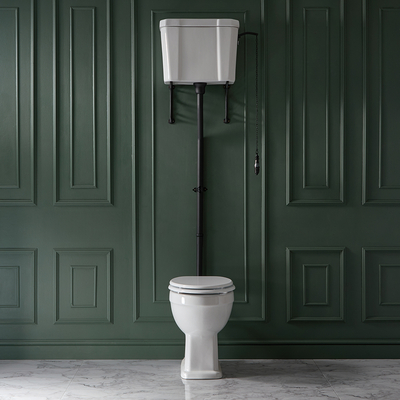 Verleihen Sie Ihrem Bad mit dem traditionellen WC inklusive hohem Spülkasten einen authentischen Retro-Look. Das Ensemble umfasst das Zubehör für den Spülkasten und einen WC-Sitz. Die dekorativen Spülkastenhalterungen und die zauberhaften Details versprühen dabei zeitlose Eleganz. Betont wird die Vintage-Optik durch die lange Spülkette und den Keramikgriff – ein echter Blickfang! Kombinieren Sie das Set mit anderen Artikeln aus der Richmond Kollektion, um Ihr Badezimmer stimmig und stilvoll zu gestalten. Eigenschaften: Spülkastenzubehör in Schwarz Sitz in Weiß mit Chrom Scharnieren Dimensionen: B 474mm x T 625 mm x H 2140mm Toilettenschüssel Höhe: 395mm Traditionelles Design für eine zeitlose und elegante Optik Hoher Spülkasten inklusive Spülrohr, Spülkette mit Keramikgriff und Halterungen Aus langlebiger Keramik mit pflegeleichter Glasur in Weiß Tiefspüler WC mit waagrechtem Abgang Hochwertiger Sitz aus Holzwerkstoff Mit WC-Montagezubehör Was wird mitgeliefertspülkastenzubehör in Schwarz Sitz in...