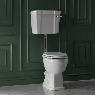 Das WC mit Spülkasten und WC-Sitz verleiht Ihrem Bad einen zauberhaften Vintage-Look, der nie aus der Mode kommt. Das Design überzeugt durch eine authentische Retro-Optik und besteht dabei aus hochwertiger Keramik, die mit einer strapazierbaren und pflegeleichten Glasur in Weiß versehen ist. Kombinieren Sie das Set mit anderen Artikeln aus der Richmond Kollektion, um Ihr Badezimmer stimmig und stilvoll zu gestalten. Eigenschaften: Spülkastenzubehör in Chrom Sitz in Weiß mit Chrom Scharnieren Dimensionen: B 474mm x T 660mm x H 985mm Toilettenschüssel Höhe: 395mm Traditionelles Design für eine zeitlose und elegante Optik 6 Liter Spülkasten mit Halterung und Keramikhebel Hochwertiger Sitz aus Holzwerkstoff Aus langlebiger Keramik mit pflegeleichter Glasur in Weiß Tiefspüler WC mit waagrechtem Abgang Mit WC-Montagezubehör Was wird mitgeliefertspülkastenzubehör in Chrom Sitz in Weiß mit Chrom Scharnieren Sie benötigen dazu (siehe Zusatzprodukte): WC-Abflussrohr