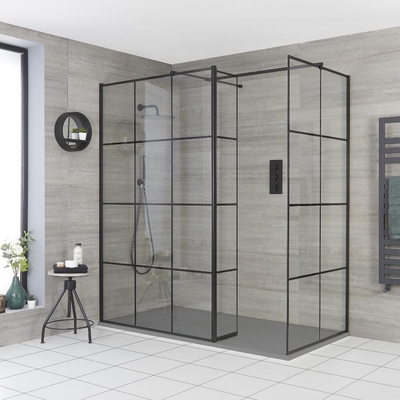 Setzen Sie mit der Barq Walk-In Dusche mit Gittermuster, inklusive beweglichem Seitenpaneel, Duschwanne mit Schiefer-Effekt und Ablauf mit hoher Ablaufleistung, ein stilvolles Statement in Ihrem Badezimmer. Die Duschwände aus Glas schützen das Bad mit einer Höhe von 1950mm vor ungewünschten Wasserspritzern, während das schwarze Gittermuster sofort ins Auge fällt. Das Muster ist dabei auf der Außenseite angebracht, um die Reinigung zu erleichtern. Das 8mm verstärkte Sicherheitsglas verspricht zudem extra Stabilität und Langlebigkeit. Die Duschwanne ist leicht und dennoch überaus robust, und der Schiefer-Effekt sorgt für ein natürliches Ambiente. Sie ist nur 30mm hoch und erleichtert somit den Duschzugang, Vervollständigen Sie den Look mit einem unserer stilvollen Nox Duschsysteme in Schwarz und genießen Sie ein luxuriöses Duscherlebnis. Eigenschaften: Größe der Duschwanne: 1800 x 900mm Eingangsbereich: 600mm breit Duschwanne mit Schiefer-Effekt in Hellgrau Für Eckeinbau geeignet Flache Duschwa...