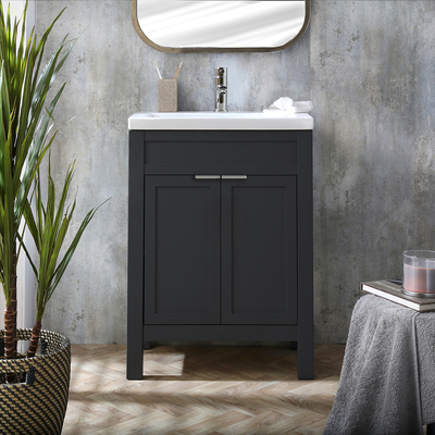 Der freistehende Warwick 600mm Waschtisch mit Unterschrank in Schwarzgrau inklusive Waschbecken und Griffleiste für Möbel in Chrom bietet Ihnen praktischen Stauraum, ohne dabei auf eine schicke Optik im Bad zu verzichten. Der robuste Unterschrank überzeugt mit einem eleganten Design, welches durch ein robustes Finish in Schwarzgrau perfekt in Szene gesetzt wird und somit jedem Einrichtungsstil schmeichelt. Hinzu kommt ein integriertes Regal, auf dem Sie allerlei Badartikel aufbewahren können – so bleibt Ihnen das ordentliche Erscheinungsbild im Bad erhalten. Die sanft schließende Türen reduzieren dabei den Verschleiß und minimieren die Geräusche. Das mitgelieferte Waschbecken ist mit einem Hahnloch versehen und besteht aus hochwertiger Keramik, zudem überzeugt es mit einer pflegeleichten Oberfläche. Mit einem unserer Einloch-Waschtischarmaturen lässt sich der Look perfekt abrunden. Eigenschaften: Dimensionen gesamt: B 615 mm x T 400 mm x H 800 mm Dimensionen Waschbecken: B 615 mm x T 400 mm...