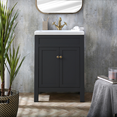 Der freistehende Warwick 600mm Waschtisch mit Unterschrank in Schwarzgrau inklusive Waschbecken und Möbelknauf in gebürstetem Messing bietet Ihnen praktischen Stauraum, ohne dabei auf eine schicke Optik im Bad zu verzichten. Der robuste Unterschrank überzeugt mit einem eleganten Design, welches durch ein robustes Finish in Schwarzgrau perfekt in Szene gesetzt wird und somit jedem Einrichtungsstil schmeichelt. Hinzu kommt ein integriertes Regal, auf dem Sie allerlei Badartikel aufbewahren können – so bleibt Ihnen das ordentliche Erscheinungsbild im Bad erhalten. Die sanft schließende Türen reduzieren dabei den Verschleiß und minimieren die Geräusche. Das mitgelieferte Waschbecken ist mit einem Hahnloch versehen und besteht aus hochwertiger Keramik, zudem überzeugt es mit einer pflegeleichten Oberfläche. Mit einem unserer Einloch-Waschtischarmaturen lässt sich der Look perfekt abrunden. Eigenschaften: Dimensionen gesamt: B 615 mm x T 400 mm x H 800 mm Dimensionen Waschbecken: B 615 mm x T 400...