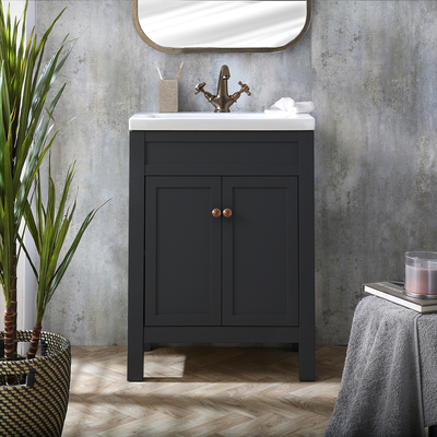 Der freistehende Warwick 600mm Waschtisch mit Unterschrank in Schwarzgrau inklusive Waschbecken und Möbelknauf in gebürsteter Bronze bietet Ihnen praktischen Stauraum, ohne dabei auf eine schicke Optik im Bad zu verzichten. Der robuste Unterschrank überzeugt mit einem eleganten Design, welches durch ein robustes Finish in Schwarzgrau perfekt in Szene gesetzt wird und somit jedem Einrichtungsstil schmeichelt. Hinzu kommt ein integriertes Regal, auf dem Sie allerlei Badartikel aufbewahren können – so bleibt Ihnen das ordentliche Erscheinungsbild im Bad erhalten. Die sanft schließende Türen reduzieren dabei den Verschleiß und minimieren die Geräusche. Das mitgelieferte Waschbecken ist mit einem Hahnloch versehen und besteht aus hochwertiger Keramik, zudem überzeugt es mit einer pflegeleichten Oberfläche. Mit einem unserer Einloch-Waschtischarmaturen lässt sich der Look perfekt abrunden. Eigenschaften: Dimensionen gesamt: B 615 mm x T 400 mm x H 800 mm Dimensionen Waschbecken: B 615 mm x T 400 m...