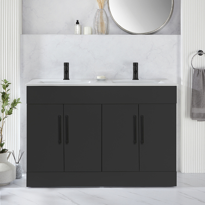 Verleihen Sie Ihrem Badezimmer einen neuen Stil mit dem modernen 1210mm Waschtischunterschrank in Schwarzgrau mit Doppelwaschbecken und modernen Möbelgriffen in Schwarz. Dieser Waschtisch überzeugt mit einem klaren, minimalistischen Design und einem atemberaubenden Finish in Schwarzgrau. Der Cluo-Waschtischunterschrank ist eine stilvolle und praktische Aufbewahrungslösung für Ihre Badezimmerutensilien und verfügt über ein bodenstehendes Design. Die Soft-Close-Türen verhindern ein geräuschvolles Zuschlagen. Das mitgelieferte Doppelwaschbecken verfügt über jeweils eine Hahnlochvorbohrung und kann ideal mit einer unserer 1-Loch Waschtisch Armaturen kombiniert werden.Wählen Sie aus einer großen Auswahl an modernen 1-Loch Waschtisch Armaturen aus und vervollständigen so Ihren neuen Waschtischunterschrank. Eigenschaften: Dimensionen Einheit: B 1188 mm x T 461 mm x H 800 mm Dimensionen Doppelwaschbecken: B 1210 mm x T 465 mm x H 18 mm Stilvolle und praktische Aufbewahrungslösung für Ihre Badezim...