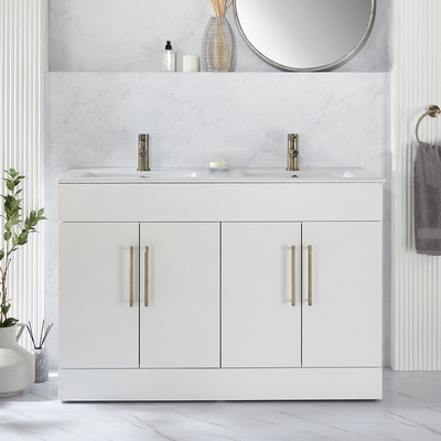 Verleihen Sie Ihrem Badezimmer einen neuen Stil mit dem modernen 1210mm Waschtischunterschrank in Weiß mit Doppelwaschbecken und modernen Möbelgriffen in gebürtetem Messing. Dieser Waschtisch überzeugt mit einem klaren, minimalistischen Design und einem atemberaubenden Finish in Weiß. Der Cluo-Waschtischunterschrank ist eine stilvolle und praktische Aufbewahrungslösung für Ihre Badezimmerutensilien und verfügt über ein bodenstehendes Design. Die Soft-Close-Türen verhindern ein geräuschvolles Zuschlagen. Das mitgelieferte Doppelwaschbecken verfügt über jeweils eine Hahnlochvorbohrung und kann ideal mit einer unserer 1-Loch Waschtisch Armaturen kombiniert werden.Wählen Sie aus einer großen Auswahl an modernen 1-Loch Waschtisch Armaturen aus und vervollständigen so Ihren neuen Waschtischunterschrank. Eigenschaften: Dimensionen Einheit: B 1188 mm x T 461 mm x H 800 mm Dimensionen Doppelwaschbecken: B 1210 mm x T 465 mm x H 18 mm Stilvolle und praktische Aufbewahrungslösung für Ihre Badezimmer...