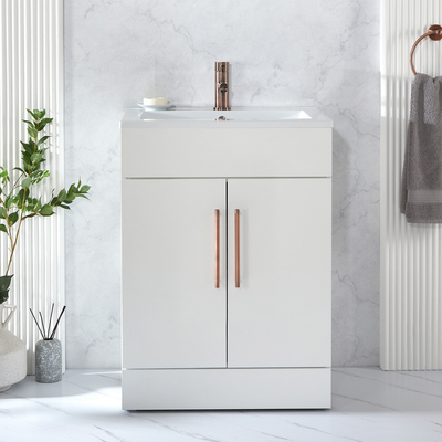 Verleihen Sie Ihrem Badezimmer einen neuen Stil mit dem modernen 610mm Waschtischunterschrank in Weiß mit Waschbecken und modernen Möbelgriffen in gebürsteter Bronze. Dieser Waschtisch überzeugt mit einem klaren, minimalistischen Design und einem atemberaubenden Finish in Weiß. Der Cluo-Waschtischunterschrank ist eine stilvolle und praktische Aufbewahrungslösung für Ihre Badezimmerutensilien und verfügt über ein bodenstehendes Design. Die Soft-Close-Türen verhindern ein geräuschvolles Zuschlagen. Das mitgelieferte Waschbecken verfügt über eine Hahnlochvorbohrung und kann ideal mit einer unserer 1-Loch Waschtisch Armaturen kombiniert werden.Wählen Sie aus einer großen Auswahl an modernen 1-Loch Waschtisch Armaturen aus und vervollständigen so Ihren neuen Waschtischunterschrank. Eigenschaften: Dimensionen Einheit: B 593 mm x T 460 mm x H 800 mm Dimensionen Waschbecken: B 610 mm x T 465 mm x H 18 mm Stilvolle und praktische Aufbewahrungslösung für Ihre Badezimmerutensilien Soft-Close-Türen zu...