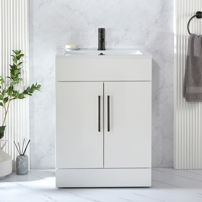Verleihen Sie Ihrem Badezimmer einen neuen Stil mit dem modernen 610mm Waschtischunterschrank in Weiß mit Waschbecken und modernen Möbelgriffen in Schwarz. Dieser Waschtisch überzeugt mit einem klaren, minimalistischen Design und einem atemberaubenden Finish in Weiß. Der Cluo-Waschtischunterschrank ist eine stilvolle und praktische Aufbewahrungslösung für Ihre Badezimmerutensilien und verfügt über ein bodenstehendes Design. Die Soft-Close-Türen verhindern ein geräuschvolles Zuschlagen. Das mitgelieferte Waschbecken verfügt über eine Hahnlochvorbohrung und kann ideal mit einer unserer 1-Loch Waschtisch Armaturen kombiniert werden.Wählen Sie aus einer großen Auswahl an modernen 1-Loch Waschtisch Armaturen aus und vervollständigen so Ihren neuen Waschtischunterschrank. Eigenschaften: Dimensionen Einheit: B 593 mm x T 460 mm x H 800 mm Dimensionen Waschbecken: B 610 mm x T 465 mm x H 18 mm Stilvolle und praktische Aufbewahrungslösung für Ihre Badezimmerutensilien Soft-Close-Türen zur Geräuschm...