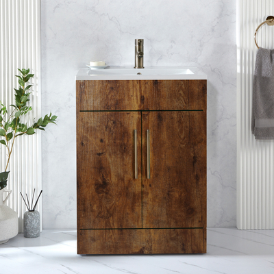 Verleihen Sie Ihrem Badezimmer einen neuen Stil mit dem modernen 610mm Waschtischunterschrank in dunkler Eiche mit Waschbecken und modernen Möbelgriffen in gebürtetem Messing. Dieser Waschtisch überzeugt mit einem klaren, minimalistischen Design und einem atemberaubenden Finish in dunkler Eiche. Der Cluo-Waschtischunterschrank ist eine stilvolle und praktische Aufbewahrungslösung für Ihre Badezimmerutensilien und verfügt über ein bodenstehendes Design. Die Soft-Close-Türen verhindern ein geräuschvolles Zuschlagen. Das mitgelieferte Waschbecken verfügt über eine Hahnlochvorbohrung und kann ideal mit einer unserer 1-Loch Waschtisch Armaturen kombiniert werden.Wählen Sie aus einer großen Auswahl an modernen 1-Loch Waschtisch Armaturen aus und vervollständigen so Ihren neuen Waschtischunterschrank. Eigenschaften: Dimensionen Einheit: B 593 mm x T 460 mm x H 800 mm Dimensionen Waschbecken: B 610 mm x T 465 mm x H 18 mm Stilvolle und praktische Aufbewahrungslösung für Ihre Badezimmerutensilien S...