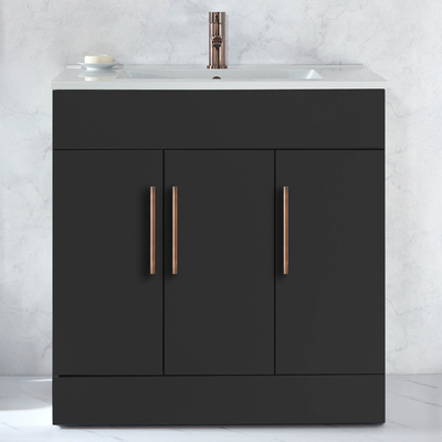 Verleihen Sie Ihrem Badezimmer einen neuen Stil mit dem modernen 810mm Waschtischunterschrank in Schwarzgrau mit Waschbecken und modernen Möbelgriffen in gebürsteter Bronze. Dieser Waschtisch überzeugt mit einem klaren, minimalistischen Design und einem atemberaubenden Finish in Schwarzgrau. Der Cluo-Waschtischunterschrank ist eine stilvolle und praktische Aufbewahrungslösung für Ihre Badezimmerutensilien und verfügt über ein bodenstehendes Design. Die Soft-Close-Türen verhindern ein geräuschvolles Zuschlagen. Das mitgelieferte Waschbecken verfügt über eine Hahnlochvorbohrung und kann ideal mit einer unserer 1-Loch Waschtisch Armaturen kombiniert werden.Wählen Sie aus einer großen Auswahl an modernen 1-Loch Waschtisch Armaturen aus und vervollständigen so Ihren neuen Waschtischunterschrank. Eigenschaften: Dimensionen Einheit: B 790 mm x T 460 mm x H 800 mm Dimensionen Waschbecken: B 810 mm x T 465 mm x H 18 mm Stilvolle und praktische Aufbewahrungslösung für Ihre Badezimmerutensilien Soft-...