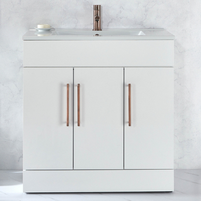 Verleihen Sie Ihrem Badezimmer einen neuen Stil mit dem modernen 810mm Waschtischunterschrank in Weiß mit Waschbecken und modernen Möbelgriffen in gebürsteter Bronze. Dieser Waschtisch überzeugt mit einem klaren, minimalistischen Design und einem atemberaubenden Finish in Weiß. Der Cluo-Waschtischunterschrank ist eine stilvolle und praktische Aufbewahrungslösung für Ihre Badezimmerutensilien und verfügt über ein bodenstehendes Design. Die Soft-Close-Türen verhindern ein geräuschvolles Zuschlagen. Das mitgelieferte Waschbecken verfügt über eine Hahnlochvorbohrung und kann ideal mit einer unserer 1-Loch Waschtisch Armaturen kombiniert werden.Wählen Sie aus einer großen Auswahl an modernen 1-Loch Waschtisch Armaturen aus und vervollständigen so Ihren neuen Waschtischunterschrank. Eigenschaften: Dimensionen Einheit: B 790 mm x T 460 mm x H 800 mm Dimensionen Waschbecken: B 810 mm x T 465 mm x H 18 mm Stilvolle und praktische Aufbewahrungslösung für Ihre Badezimmerutensilien Soft-Close-Türen zu...