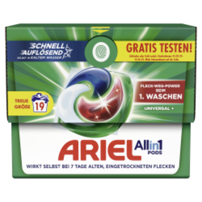 Die Ariel All in 1 Universal PODS Vollwaschmittel haben getrennte Kammern, die die Inhaltsstoffe erst dann freisetzen, wenn sie während des Waschvorgangs benötigt werden und bieten eine hochkonzentrierte Reinigungsleistung. Die innovative Folie löst sich bei Kontakt mit Wasser vollständig auf, um die leistungsstarken Inhaltsstoffe freizusetzen, die ein breites Fleckenspektrum bekämpfen. Anwendung: Pod hinten in die leere Trommel legen Wäsche darauf legen und Programm wählen Packung verschließen und für Kinder unzugänglich aufbewahren Weitere Informationen entnehmen Sie bitte dem Sicherheitsdatenblatt. ...
