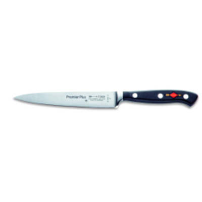 Die Schneide des geschmiedeten Steakmessers aus der Serie Premier Plus ist zum Teil glatt, zum Teil mit einem feinen Zackenschliff versehen. Dank des Vollkropfs zwischen Klinge und Griff sind Ihre Finger beim Schneiden geschützt. Der ergonomisch geformte Griff liegt angenehm in der Hand und ist spaltenfrei mit der Klinge verbunden. Das edle schwarz-rote F. DICK Logo auf der Klinge ist ein zusätzlicher Eyecatcher und macht das Messer zu etwas Besonderem. Klingenlänge: 12 cm, Klinge aus X50 Cr Mo V15, Griff aus hygienischem Kunststoff. Made in Germany. Die ausgewogene Härte von 56° HRC ist der ideale Kompromiss für perfekte Schnitthaltigkeit und leichtes Nachschärfen. ...
