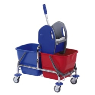 Robuster, verchromter Doppelfahrwagen mit zwei Eimern 25 l, inklusive 4 Räder 75mm Durchmesser und Anfahrschutz.