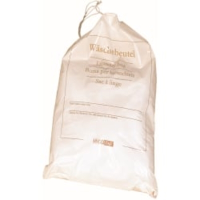 Der weiße Wäschebeutel ist mit einem goldenen Aufdruck bedruckt. Zudem ist er verschließbar durch ein eingearbeitetes Zu - - 5581 Franz Mensch