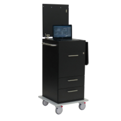 Der novocal Laptopwagen sind entweder mit einer absenk- und abschließbaren Laptop-Ablage mit automatischem Liftsystem (- - - LAW4210-A Novocal