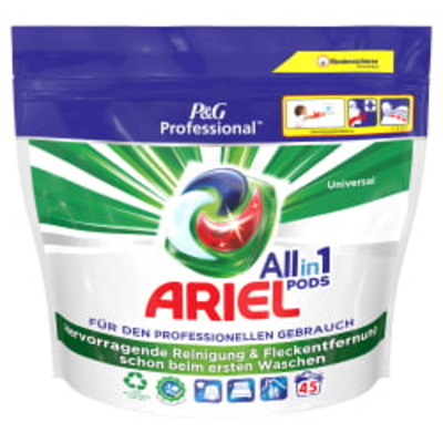 P&G Professional Ariel All-in-1 PODS Vollwaschmittel bestehen aus mehreren Fächern, die die Inhaltsstoffe getrennt halten, bis sie mit der Wäsche in Berührung kommen. Der Film löst sich im Wasser vollständig auf und setzt eine kraftvolle Reinigungstechnologie frei, die mit genau der richtigen Menge an Flüssigwaschmittel eine große Bandbreite an Flecken beseitigt. ...