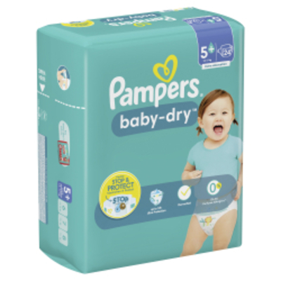 Die Pampers Baby Dry 5+ Junior Plus Windeln, 12-17kg mit extra Trockenheitslage, die Flüssigkeiten schnell absorbiert. - - 8006540715536 Pampers