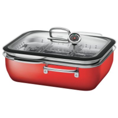 Der SILIT Dampfgarer ecompact Energy Red mit Deckel, 4-teiliges Set ist ein geschlossenes System für den Herd. In den rechteckigen unteren Teil füllen Sie eine kleine Menge Wasser oder Fond und legen die Zutaten nebeneinander auf das Garblech. Ein Glasdeckel schließt die kleine Garküche luftdicht ab, das integrierte Thermometer misst zuverlässig die Temperatur. Nichts brennt an oder trocknet aus, und im Dampf bleiben die Vitamine weitgehend erhalten. Mit einem Porzellaneinsatz gelingen sogar Flans und Puddings. Der optionale digitale Cook Assistant, das durch eine App gesteuerte Kochsystem von Silit, überwacht mithilfe eines Sensors die Innentemperatur und gibt Bescheid, wenn alle Zutaten auf den Punkt gegart sind. Silit Dampfgarer sind aus rostfreiem Edelstahl, besitzen Kaltgriffe und einen Trans Therm® Allherdboden. Set besteht aus 1x Dampfgarer 35, 6x 33, 3x 18, 4 cm (V 6, 7l) 1x Glasdeckel 1x Einsatz hoch mit 2-Teiler 1x herausnehmbares Thermometer ...