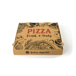 Der stabile Sobsy Pizzakarton, braun besteht aus lebensmittelechter Wellpappe mit farbigem Aufdruck. Die Pizzaschachtel - - SOBSY SY-66446