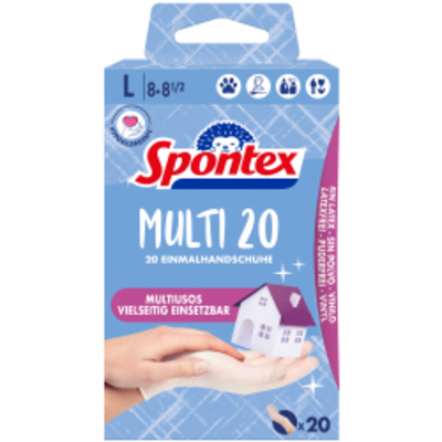 Die Spontex Multi x 20 Einmalhandschuhe, haben einen hohen Tragekomfort und sind puderfrei. Außerdem sind sie hypoaller - - 12.939.358 Spontex
