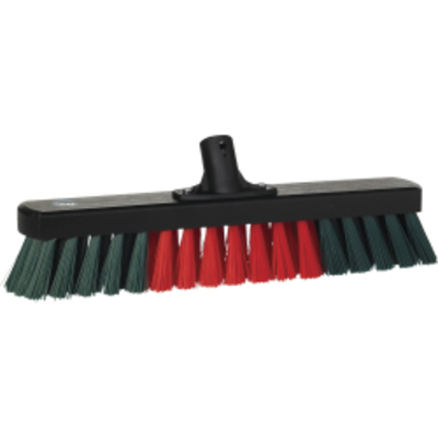 Werkstattbesen aus Holz mit einer Fassung für Stiele mit Schraubgewinde. Der Besen hat PVC-Borsten,