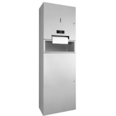 Die Kombination, bestehend aus Sensor-Papierrollenspender (batteriebetrieben) und Abfallbehälter von Wagner EWAR aus Edelstahl (Chromnickelstahl WN 1.4301) für Unterputz-Montage. Ganzedelstahlgehäuse; alle Ecken voll verschweißt. Elektrischer Papierrollenspender mit berührungslos bedienbarer, kapazitiver Sensorik. Papierlänge und Totzeit einstellbar. Batteriebetrieb mit vier handelsüblichen 1, 5 V Monozellen. Vorgesehen für eine Papierrolle in den Abmessungen: Breite 215 mm, Außendurchmesser max. 180 mm, Innendurchmesser 50 mm. Sichtschlitz als Füllstandsanzeige. Abfallbehälter ausgestattet mit herausnehmbarem Gitterkorb. Fassungsvermögen ca. 48 Liter. Zugänglich über abschließbare Türen. Zylinderschlösser gleichschließend aus korrosionsbeständigem Zinkdruckguss. Montage: Mit sechs Schrauben in bauseitigen Ausschnitt durch Befestigungslöcher in den Seitenwänden. Die Kombination, bestehend aus Sensor-Papierrollenspender (batteriebetrieben) und ...