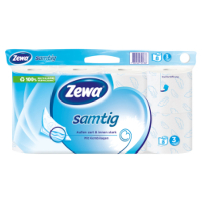 Erleben Sie Weichheit für die ganze Familie und anspruchsvolle Reinigung mit innovativer Kombilagen-Qualität. Das 3-lagige Zewa Samtig Toilettenpapier besteht aus einer Lage konventionellem Papier und zwei Lagen in spezieller TAD-Qualität, die besonders zuverlässig sind. Auf diese Weise ist Zewa samtig außerordentlich sicher und so samtig, wie es der Name verspricht. ...