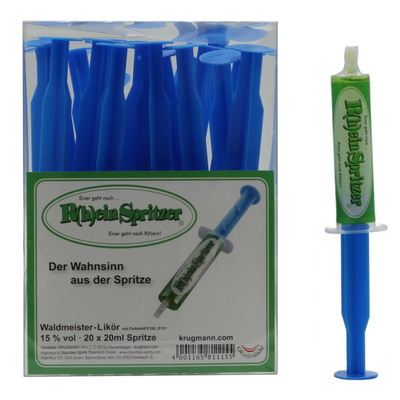 ...R (h)ein Spritzer Waldmeisterlikör Der Rhein Spritzer ist ein köstlicher Waldmeisterlikör auf Wodkabasis. Nicht nur die Farbe ist bemerkenswert, auch der Geschmack, aber vor allem die Aufmachung ist interessant: An Stelle von sonstigen Miniaturfläschchen, wird dieser Likör in einer Kunststoff-Spritze geliefert. 20 Stück an der Zahl mit je 20 ml Inhalt, in einer durchsichtigen Plastikbox. Auffälliger Partyspaß für jeden Feierwütigen – egal, ob zu Halloween oder zum Geburtstag, zum Junggesellenabschied oder zur Abifete – Der Rhein Spritzer Waldmeisterlikör ist nahezu unentbehrlich für solche Angelegenheiten! Sollte der Geschmack von Waldmeister nicht die bevorzugte Wahl sein, dann hilft eventuell Himbeere weiter, die ebenfalls aus dem Hause Krugmann stammt. Der originelle Likör aus der Spritze Klingt komisch? Ist es auch! Viel Vergnügen ist beim Trinken aus der Spritze garantiert. Mit der etwas anderen Art des Genießens, steht einem lustigen, geselligen Abend nichts im Wege! Außerdem...