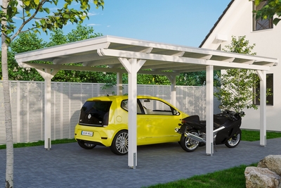 Carport Emsland SKAN HOLZ Carport Emsland• Flachdach-Carport• Außenmaße 404 x 604 cm• massive Konstruktion aus hochwertigem Leimholz (BSH-Fichte)• farblich behandelt in weiß• Pfosten 12 x 12 cm inkl. H-Pfostenankern• Aluminium-Dachplatten, anthrazit farbbeschichtet• Holzblende mit Aluminium-Abschlusskante• inkl. Kunststoff-Regenrinne mit Fallrohr Konstruktion Die Konstruktion ist aus Leimholz gefertigt. Dieses besteht aus mehreren getrockneten, der Länge nach durch Keilzinkung verbundenen Lagen. Diese werden übereinander wetterfest verleimt. So entsteht ein tragfähiger Balken der gegenüber natürlich gewachsenem Holz verwindungsärmer ist und weniger zur Rissbildung neigt. Farbliche Behandlung Die farblich behandelten Teile des Bausatzes sind mit hochwertiger Lasur bzw. Farbe behandelt. Diese schützt das Holz vor Bläuebefall, vor Schäden durch UV-Licht, vermindert das Quell- und Schwundverhalten und läßt trotzdem die Holzstruktur durchscheinen. Die Teile werden im Werk 2x allseitig mit Lasur geflutet und der Überschuss anschließend abgebürstet. Sie können sofort nach der Anlieferung mit dem Aufbau beginnen, das lästige Grundieren und Streichen entfällt. Jedem Bausatz liegt eine Reparaturmenge Farbe, bzw. Lasur bei, diese nutzen Sie, um Beschädigungen bzw. montagenotwendige Schnitt- und Schraubstellen mindestens 2x zu behandeln. Wenn Sie eine zusätzliche Veredelung der Oberfläche wünschen, schleifen Sie nach der Montage die sichtbaren Oberflächen leicht an und streichen diese mit hochwertiger Lasur bzw. Farbe. Nutzen Sie dazu unser optionales Farb- bzw. Lasursortiment. Abgedruckte Farbmuster sind nicht verbindlich, farbliche Abweichungen können auftreten. Ablagespuren bei farblich allseitig behandelten Bauteilen sind technisch bedingt. Dacheindeckung Die Dacheindeckung besteht aus Aluminium-Dachplatten mit Trapezprofil, farbbeschichtet (Oberseite anthrazit/ Unterseite lichtgrau). Bruchsicher und hagelbeständig. Hohe Geräuschentwicklung bei Niederschlag. Kondensbildung bei Temperaturschwankungen möglich. Hohe Formstabilität bei hohen Oberflächentemperaturen. Verankerung 60 cm lange H-Anker aus verzinktem Flachstahl zum Einbetonieren in das bauseitig erstellte Punktfundament (Größe und Ausführung siehe Montageanleitung) sind im Bausatz enthalten. Sie verbinden die Pfosten fest mit dem Untergrund und sorgen für hohe Stabilität. Die Anker liefern wir Ihnen auf Wunsch gerne zusammen mit dem passenden Fundamentplan zu. Bitte geben Sie dies, so gewünscht, unbedingt bei Bestellung mit an.
