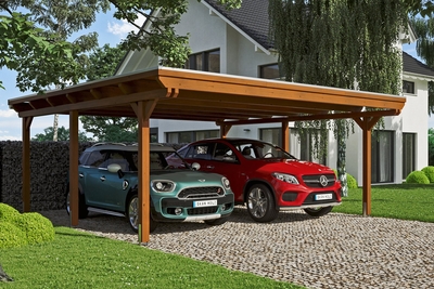 Carport Emsland SKAN HOLZ Carport Emsland• Flachdach-Carport• Außenmaße 613 x 604 cm• massive Konstruktion aus hochwertigem Leimholz (BSH-Fichte)• farblich behandelt in nussbaum• Pfosten 12 x 12 cm inkl. H-Pfostenankern• Aluminium-Dachplatten, anthrazit farbbeschichtet• Holzblende mit Aluminium-Abschlusskante• inkl. Kunststoff-Regenrinne mit Fallrohr Konstruktion Die Konstruktion ist aus Leimholz gefertigt. Dieses besteht aus mehreren getrockneten, der Länge nach durch Keilzinkung verbundenen Lagen. Diese werden übereinander wetterfest verleimt. So entsteht ein tragfähiger Balken der gegenüber natürlich gewachsenem Holz verwindungsärmer ist und weniger zur Rissbildung neigt. Farbliche Behandlung Die farblich behandelten Teile des Bausatzes sind mit hochwertiger Lasur bzw. Farbe behandelt. Diese schützt das Holz vor Bläuebefall, vor Schäden durch UV-Licht, vermindert das Quell- und Schwundverhalten und läßt trotzdem die Holzstruktur durchscheinen. Die Teile werden im Werk 2x allseitig mit Lasur geflutet und der Überschuss anschließend abgebürstet. Sie können sofort nach der Anlieferung mit dem Aufbau beginnen, das lästige Grundieren und Streichen entfällt. Jedem Bausatz liegt eine Reparaturmenge Farbe, bzw. Lasur bei, diese nutzen Sie, um Beschädigungen bzw. montagenotwendige Schnitt- und Schraubstellen mindestens 2x zu behandeln. Wenn Sie eine zusätzliche Veredelung der Oberfläche wünschen, schleifen Sie nach der Montage die sichtbaren Oberflächen leicht an und streichen diese mit hochwertiger Lasur bzw. Farbe. Nutzen Sie dazu unser optionales Farb- bzw. Lasursortiment. Abgedruckte Farbmuster sind nicht verbindlich, farbliche Abweichungen können auftreten. Ablagespuren bei farblich allseitig behandelten Bauteilen sind technisch bedingt. Dacheindeckung Die Dacheindeckung besteht aus Aluminium-Dachplatten mit Trapezprofil, farbbeschichtet (Oberseite anthrazit/ Unterseite lichtgrau). Bruchsicher und hagelbeständig. Hohe Geräuschentwicklung bei Niederschlag. Kondensbildung bei Temperaturschwankungen möglich. Hohe Formstabilität bei hohen Oberflächentemperaturen. Verankerung 60 cm lange H-Anker aus verzinktem Flachstahl zum Einbetonieren in das bauseitig erstellte Punktfundament (Größe und Ausführung siehe Montageanleitung) sind im Bausatz enthalten. Sie verbinden die Pfosten fest mit dem Untergrund und sorgen für hohe Stabilität. Die Anker liefern wir Ihnen auf Wunsch gerne zusammen mit dem passenden Fundamentplan zu. Bitte geben Sie dies, so gewünscht, unbedingt bei Bestellung mit an.