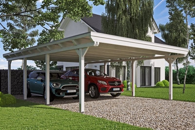Carport Emsland SKAN HOLZ Carport Emsland• Flachdach-Carport• Außenmaße 613 x 846 cm• massive Konstruktion aus hochwertigem Leimholz (BSH-Fichte)• farblich behandelt in weiß• Pfosten 12 x 12 cm inkl. H-Pfostenankern• Dacheindeckung aus 19 mm starker Dachschalung mit EPDM-Folie• Holzblende mit Aluminium-Abschlusskante• inkl. Kunststoff-Regenrinne mit Fallrohr Konstruktion Die Konstruktion ist aus Leimholz gefertigt. Dieses besteht aus mehreren getrockneten, der Länge nach durch Keilzinkung verbundenen Lagen. Diese werden übereinander wetterfest verleimt. So entsteht ein tragfähiger Balken der gegenüber natürlich gewachsenem Holz verwindungsärmer ist und weniger zur Rissbildung neigt. Farbliche Behandlung Die farblich behandelten Teile des Bausatzes sind mit hochwertiger Lasur bzw. Farbe behandelt. Diese schützt das Holz vor Bläuebefall, vor Schäden durch UV-Licht, vermindert das Quell- und Schwundverhalten und läßt trotzdem die Holzstruktur durchscheinen. Die Teile werden im Werk 2x allseitig mit Lasur geflutet und der Überschuss anschließend abgebürstet. Sie können sofort nach der Anlieferung mit dem Aufbau beginnen, das lästige Grundieren und Streichen entfällt. Jedem Bausatz liegt eine Reparaturmenge Farbe, bzw. Lasur bei, diese nutzen Sie, um Beschädigungen bzw. montagenotwendige Schnitt- und Schraubstellen mindestens 2x zu behandeln. Wenn Sie eine zusätzliche Veredelung der Oberfläche wünschen, schleifen Sie nach der Montage die sichtbaren Oberflächen leicht an und streichen diese mit hochwertiger Lasur bzw. Farbe. Nutzen Sie dazu unser optionales Farb- bzw. Lasursortiment. Abgedruckte Farbmuster sind nicht verbindlich, farbliche Abweichungen können auftreten. Ablagespuren bei farblich allseitig behandelten Bauteilen sind technisch bedingt. Dacheindeckung Die Dacheindeckung besteht aus einer 19 mm starken Dachschalung mit EPDM-Folie. EPDM-Folie ist die einfach zu verlegende, sichere und dauerhafte Dacheindeckung für Dächer mit geringer Neigung. Sie zeichnet sich durch eine lange Lebensdauer, hohe Dehnbarkeit und hervorragenden Widerstand gegen UV-Strahlung aus. Die Verlegung erfolgt in einem Stück durch Kaltverklebung mit dem mitgeliefertem Kleber. Verankerung 60 cm lange H-Anker aus verzinktem Flachstahl zum Einbetonieren in das bauseitig erstellte Punktfundament (Größe und Ausführung siehe Montageanleitung) sind im Bausatz enthalten. Sie verbinden die Pfosten fest mit dem Untergrund und sorgen für hohe Stabilität. Die Anker liefern wir Ihnen auf Wunsch gerne zusammen mit dem passenden Fundamentplan zu. Bitte geben Sie dies, so gewünscht, unbedingt bei Bestellung mit an.