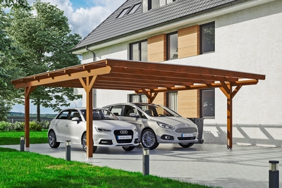 Carport Odenwald gerade Kopfbänder SKAN HOLZ Carport Odenwald• Design Flachdach-Carport• Außenmaße 640 x 648 cm• massive Konstruktion aus hochwertigem Leimholz (BSH-Fichte)• farblich behandelt in nussbaum• Pfosten 12 x 12 cm inkl. H-Pfostenankern• gerade Kopfbänder• Dacheindeckung 10 mm Polycarbonat-Doppelstegplatten in klar Konstruktion Die Konstruktion ist aus Leimholz gefertigt. Dieses besteht aus mehreren getrockneten, der Länge nach durch Keilzinkung verbundenen Lagen. Diese werden übereinander wetterfest verleimt. So entsteht ein tragfähiger Balken der gegenüber natürlich gewachsenem Holz verwindungsärmer ist und weniger zur Rissbildung neigt. Farbliche Behandlung Die farblich behandelten Teile des Bausatzes sind mit hochwertiger Lasur bzw. Farbe behandelt. Diese schützt das Holz vor Bläuebefall, vor Schäden durch UV-Licht, vermindert das Quell- und Schwundverhalten und läßt trotzdem die Holzstruktur durchscheinen. Die Teile werden im Werk 2x allseitig mit Lasur geflutet und der Überschuss anschließend abgebürstet. Sie können sofort nach der Anlieferung mit dem Aufbau beginnen, das lästige Grundieren und Streichen entfällt. Jedem Bausatz liegt eine Reparaturmenge Farbe, bzw. Lasur bei, diese nutzen Sie, um Beschädigungen bzw. montagenotwendige Schnitt- und Schraubstellen mindestens 2x zu behandeln. Wenn Sie eine zusätzliche Veredelung der Oberfläche wünschen, schleifen Sie nach der Montage die sichtbaren Oberflächen leicht an und streichen diese mit hochwertiger Lasur bzw. Farbe. Nutzen Sie dazu unser optionales Farb- bzw. Lasursortiment. Abgedruckte Farbmuster sind nicht verbindlich, farbliche Abweichungen können auftreten. Ablagespuren bei farblich allseitig behandelten Bauteilen sind technisch bedingt. Dacheindeckung Die Dacheindeckung besteht aus stabilen, 10 mm dicken Polycarbonat Doppelstegplatten. Die Oberseite ist mit einer UV-reflektierenden Schicht versehen. Befestigt werden diese durch hochwertige Aluminium-Profile mit EPDM-Lippendichtungen. Verankerung 60 cm lange H-Anker aus verzinktem Flachstahl zum Einbetonieren in das bauseitig erstellte Punktfundament (Größe und Ausführung siehe Montageanleitung) sind im Bausatz enthalten. Sie verbinden die Pfosten fest mit dem Untergrund und sorgen für hohe Stabilität. Die Anker liefern wir Ihnen auf Wunsch gerne zusammen mit dem passenden Fundamentplan zu. Bitte geben Sie dies, so gewünscht, unbedingt bei Bestellung mit an.