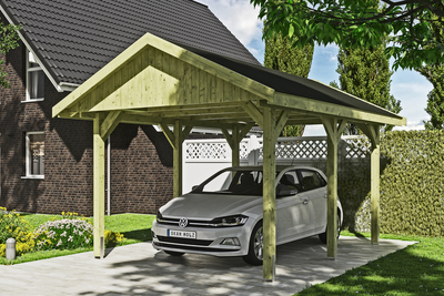 Carport Wallgau SKAN HOLZ Carport Wallgau• Satteldach-Carport• Außenmaße 380 x 500 cm• Konstruktion aus imprägniertem Nadelholz• Grün imprägniert• Pfosten 11, 5 x 11, 5 cm inkl. H-Pfostenankern• Sparrendach mit 20 mm Dachschalung• inkl. schwarzen Bitumen-Dachschindeln Konstruktion Die Konstruktion ist aus imprägniertem Nadelholz gefertigt. Das nicht technisch getrocknete massive Fichten- bzw. Kiefernholz erhält seine grünliche Farbe durch im Imprägniermittel gelöste Metallsalze. Sie schützen das Holz gegen Pilz- und Insektenbefall, ein UV-Schutz ist jedoch nicht enthalten. Durch die Imprägnierung besitzt das Holz eine höhere Restfeuchte. Durch die anschließende Trocknung kann es zu Harzaustritt, Verdrehung bzw. Bildung von Trocknungsrissen kommen, davon geht kein statischer Nachteil aus. Dies spiegelt die Natürlichkeit der verwendeten Materialien wider. Farbliche Behandlung Die Holzteile dieses Bausatzes sind durch eine Imprägnierung auf Wasserbasis vor Pilz- und Insektenbefall geschützt. Der...