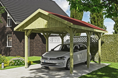 Carport Wallgau SKAN HOLZ Carport Wallgau• Satteldach-Carport• Außenmaße 380 x 500 cm• Konstruktion aus imprägniertem Nadelholz• Grün imprägniert• Pfosten 11, 5 x 11, 5 cm inkl. H-Pfostenankern• Sparrendach mit 20 mm Dachschalung• inkl. roten Bitumen-Dachschindeln Konstruktion Die Konstruktion ist aus imprägniertem Nadelholz gefertigt. Das nicht technisch getrocknete massive Fichten- bzw. Kiefernholz erhält seine grünliche Farbe durch im Imprägniermittel gelöste Metallsalze. Sie schützen das Holz gegen Pilz- und Insektenbefall, ein UV-Schutz ist jedoch nicht enthalten. Durch die Imprägnierung besitzt das Holz eine höhere Restfeuchte. Durch die anschließende Trocknung kann es zu Harzaustritt, Verdrehung bzw. Bildung von Trocknungsrissen kommen, davon geht kein statischer Nachteil aus. Dies spiegelt die Natürlichkeit der verwendeten Materialien wider. Farbliche Behandlung Die Holzteile dieses Bausatzes sind durch eine Imprägnierung auf Wasserbasis vor Pilz- und Insektenbefall geschützt. Der Bau...