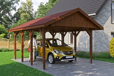 Carport Wallgau SKAN HOLZ Carport Wallgau• Satteldach-Carport• Außenmaße 430 x 600 cm• Konstruktion aus imprägniertem Nadelholz• farblich behandelt in nussbaum• Pfosten 11, 5 x 11, 5 cm inkl. H-Pfostenankern• Sparrendach mit 20 mm Dachschalung• inkl. roten Bitumen-Dachschindeln Konstruktion Die Konstruktion ist aus imprägniertem Nadelholz gefertigt. Das nicht technisch getrocknete massive Fichten- bzw. Kiefernholz erhält seine grünliche Farbe durch im Imprägniermittel gelöste Metallsalze. Sie schützen das Holz gegen Pilz- und Insektenbefall, ein UV-Schutz ist jedoch nicht enthalten. Durch die Imprägnierung besitzt das Holz eine höhere Restfeuchte. Durch die anschließende Trocknung kann es zu Harzaustritt, Verdrehung bzw. Bildung von Trocknungsrissen kommen, davon geht kein statischer Nachteil aus. Dies spiegelt die Natürlichkeit der verwendeten Materialien wider. Farbliche Behandlung Die farblich behandelten Teile des Bausatzes sind mit hochwertiger Lasur bzw. Farbe behandelt. Diese schützt d...