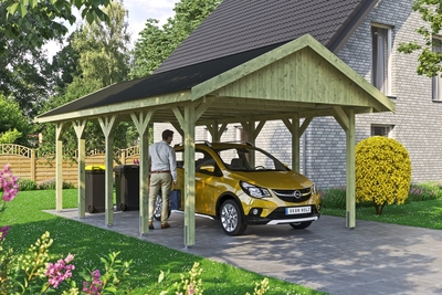 Carport Wallgau SKAN HOLZ Carport Wallgau• Satteldach-Carport• Außenmaße 430 x 750 cm• Konstruktion aus imprägniertem Nadelholz• Grün imprägniert• Pfosten 11, 5 x 11, 5 cm inkl. H-Pfostenankern• Sparrendach mit 20 mm Dachschalung• inkl. schwarzen Bitumen-Dachschindeln Konstruktion Die Konstruktion ist aus imprägniertem Nadelholz gefertigt. Das nicht technisch getrocknete massive Fichten- bzw. Kiefernholz erhält seine grünliche Farbe durch im Imprägniermittel gelöste Metallsalze. Sie schützen das Holz gegen Pilz- und Insektenbefall, ein UV-Schutz ist jedoch nicht enthalten. Durch die Imprägnierung besitzt das Holz eine höhere Restfeuchte. Durch die anschließende Trocknung kann es zu Harzaustritt, Verdrehung bzw. Bildung von Trocknungsrissen kommen, davon geht kein statischer Nachteil aus. Dies spiegelt die Natürlichkeit der verwendeten Materialien wider. Farbliche Behandlung Die Holzteile dieses Bausatzes sind durch eine Imprägnierung auf Wasserbasis vor Pilz- und Insektenbefall geschützt. Der...