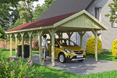 Carport Wallgau SKAN HOLZ Carport Wallgau• Satteldach-Carport• Außenmaße 430 x 900 cm• Konstruktion aus imprägniertem Nadelholz• Grün imprägniert• Pfosten 11, 5 x 11, 5 cm inkl. H-Pfostenankern• Sparrendach mit 20 mm Dachschalung• inkl. roten Bitumen-Dachschindeln Konstruktion Die Konstruktion ist aus imprägniertem Nadelholz gefertigt. Das nicht technisch getrocknete massive Fichten- bzw. Kiefernholz erhält seine grünliche Farbe durch im Imprägniermittel gelöste Metallsalze. Sie schützen das Holz gegen Pilz- und Insektenbefall, ein UV-Schutz ist jedoch nicht enthalten. Durch die Imprägnierung besitzt das Holz eine höhere Restfeuchte. Durch die anschließende Trocknung kann es zu Harzaustritt, Verdrehung bzw. Bildung von Trocknungsrissen kommen, davon geht kein statischer Nachteil aus. Dies spiegelt die Natürlichkeit der verwendeten Materialien wider. Farbliche Behandlung Die Holzteile dieses Bausatzes sind durch eine Imprägnierung auf Wasserbasis vor Pilz- und Insektenbefall geschützt. Der Bau...