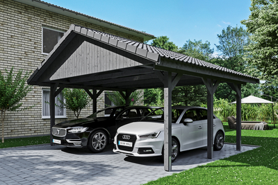 Carport Wallgau SKAN HOLZ Carport Wallgau• Satteldach-Carport• Außenmaße 620 x 500 cm• Konstruktion aus imprägniertem Nadelholz• farblich behandelt in schiefergrau• Pfosten 11, 5 x 11, 5 cm inkl. H-Pfostenankern• Sparrendach mit 38 x 57 mm Dachlatten Konstruktion Die Konstruktion ist aus imprägniertem Nadelholz gefertigt. Das nicht technisch getrocknete massive Fichten- bzw. Kiefernholz erhält seine grünliche Farbe durch im Imprägniermittel gelöste Metallsalze. Sie schützen das Holz gegen Pilz- und Insektenbefall, ein UV-Schutz ist jedoch nicht enthalten. Durch die Imprägnierung besitzt das Holz eine höhere Restfeuchte. Durch die anschließende Trocknung kann es zu Harzaustritt, Verdrehung bzw. Bildung von Trocknungsrissen kommen, davon geht kein statischer Nachteil aus. Dies spiegelt die Natürlichkeit der verwendeten Materialien wider. Farbliche Behandlung Die farblich behandelten Teile des Bausatzes sind mit hochwertiger Lasur bzw. Farbe behandelt. Diese schützt das Holz vor Bläuebefall, vor...