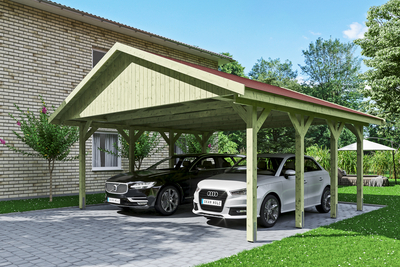 Carport Wallgau SKAN HOLZ Carport Wallgau• Satteldach-Carport• Außenmaße 620 x 600 cm• Konstruktion aus imprägniertem Nadelholz• Grün imprägniert• Pfosten 11, 5 x 11, 5 cm inkl. H-Pfostenankern• Sparrendach mit 20 mm Dachschalung• inkl. roten Bitumen-Dachschindeln Konstruktion Die Konstruktion ist aus imprägniertem Nadelholz gefertigt. Das nicht technisch getrocknete massive Fichten- bzw. Kiefernholz erhält seine grünliche Farbe durch im Imprägniermittel gelöste Metallsalze. Sie schützen das Holz gegen Pilz- und Insektenbefall, ein UV-Schutz ist jedoch nicht enthalten. Durch die Imprägnierung besitzt das Holz eine höhere Restfeuchte. Durch die anschließende Trocknung kann es zu Harzaustritt, Verdrehung bzw. Bildung von Trocknungsrissen kommen, davon geht kein statischer Nachteil aus. Dies spiegelt die Natürlichkeit der verwendeten Materialien wider. Farbliche Behandlung Die Holzteile dieses Bausatzes sind durch eine Imprägnierung auf Wasserbasis vor Pilz- und Insektenbefall geschützt. Der Bau...