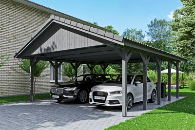 Carport Wallgau SKAN HOLZ Carport Wallgau• Satteldach-Carport• Außenmaße 620 x 750 cm• Konstruktion aus imprägniertem Nadelholz• farblich behandelt in schiefergrau• Pfosten 11, 5 x 11, 5 cm inkl. H-Pfostenankern• Sparrendach mit 38 x 57 mm Dachlatten Konstruktion Die Konstruktion ist aus imprägniertem Nadelholz gefertigt. Das nicht technisch getrocknete massive Fichten- bzw. Kiefernholz erhält seine grünliche Farbe durch im Imprägniermittel gelöste Metallsalze. Sie schützen das Holz gegen Pilz- und Insektenbefall, ein UV-Schutz ist jedoch nicht enthalten. Durch die Imprägnierung besitzt das Holz eine höhere Restfeuchte. Durch die anschließende Trocknung kann es zu Harzaustritt, Verdrehung bzw. Bildung von Trocknungsrissen kommen, davon geht kein statischer Nachteil aus. Dies spiegelt die Natürlichkeit der verwendeten Materialien wider. Farbliche Behandlung Die farblich behandelten Teile des Bausatzes sind mit hochwertiger Lasur bzw. Farbe behandelt. Diese schützt das Holz vor Bläuebefall, vor...