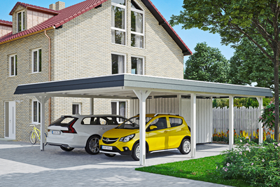 Carport Wendland mit Abstellraum SKAN HOLZ Carport Wendland• Flachdach-Carport• Außenmaße 630 x 879 cm• mit Abstellraum• massive Konstruktion aus hochwertigem Leimholz (BSH-Fichte)• farblich behandelt in weiß• Pfosten 12 x 12 cm inkl. H-Pfostenankern• Dacheindeckung aus 19 mm starker Dachschalung mit EPDM-Folie• umlaufende schwarze Blende in Schieferoptik mit Aluminium-Abschlusskante• inkl. Kunststoff-Regenrinne mit Fallrohr Konstruktion Die Konstruktion ist aus Leimholz gefertigt. Dieses besteht aus mehreren getrockneten, der Länge nach durch Keilzinkung verbundenen Lagen. Diese werden übereinander wetterfest verleimt. So entsteht ein tragfähiger Balken der gegenüber natürlich gewachsenem Holz verwindungsärmer ist und weniger zur Rissbildung neigt. Farbliche Behandlung Die farblich behandelten Teile des Bausatzes sind mit hochwertiger Lasur bzw. Farbe behandelt. Diese schützt das Holz vor Bläuebefall, vor Schäden durch UV-Licht, vermindert das Quell- und Schwundverhalten und läßt trotzdem die Holzstruktur durchscheinen. Die Teile werden im Werk 2x allseitig mit Lasur geflutet und der Überschuss anschließend abgebürstet. Sie können sofort nach der Anlieferung mit dem Aufbau beginnen, das lästige Grundieren und Streichen entfällt. Jedem Bausatz liegt eine Reparaturmenge Farbe, bzw. Lasur bei, diese nutzen Sie, um Beschädigungen bzw. montagenotwendige Schnitt- und Schraubstellen mindestens 2x zu behandeln. Wenn Sie eine zusätzliche Veredelung der Oberfläche wünschen, schleifen Sie nach der Montage die sichtbaren Oberflächen leicht an und streichen diese mit hochwertiger Lasur bzw. Farbe. Nutzen Sie dazu unser optionales Farb- bzw. Lasursortiment. Abgedruckte Farbmuster sind nicht verbindlich, farbliche Abweichungen können auftreten. Ablagespuren bei farblich allseitig behandelten Bauteilen sind technisch bedingt. Dacheindeckung Die Dacheindeckung besteht aus einer 19 mm starken Dachschalung mit EPDM-Folie. EPDM-Folie ist die einfach zu verlegende, sichere und dauerhafte Dacheindeckung für Dächer mit geringer Neigung. Sie zeichnet sich durch eine lange Lebensdauer, hohe Dehnbarkeit und hervorragenden Widerstand gegen UV-Strahlung aus. Die Verlegung erfolgt in einem Stück durch Kaltverklebung mit dem mitgeliefertem Kleber. Verankerung 60 cm lange H-Anker aus verzinktem Flachstahl zum Einbetonieren in das bauseitig erstellte Punktfundament (Größe und Ausführung siehe Montageanleitung) sind im Bausatz enthalten. Sie verbinden die Pfosten fest mit dem Untergrund und sorgen für hohe Stabilität. Die Anker liefern wir Ihnen auf Wunsch gerne zusammen mit dem passenden Fundamentplan zu. Bitte geben Sie dies, so gewünscht, unbedingt bei Bestellung mit an.