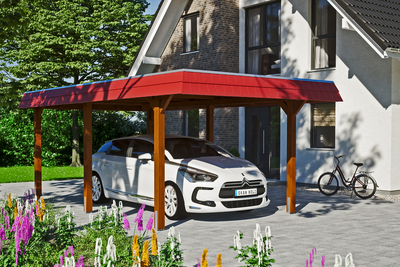Carport Wendland SKAN HOLZ Carport Wendland• Flachdach-Carport• Außenmaße 362 x 628 cm• massive Konstruktion aus hochwertigem Leimholz (BSH-Fichte)• farblich behandelt in nussbaum• Pfosten 12 x 12 cm inkl. H-Pfostenankern• Aluminium-Dachplatten, anthrazit farbbeschichtet• umlaufende rote Blende in Schieferoptik mit Aluminium-Abschlusskante• inkl. Kunststoff-Regenrinne mit Fallrohr Konstruktion Die Konstruktion ist aus Leimholz gefertigt. Dieses besteht aus mehreren getrockneten, der Länge nach durch Keilzinkung verbundenen Lagen. Diese werden übereinander wetterfest verleimt. So entsteht ein tragfähiger Balken der gegenüber natürlich gewachsenem Holz verwindungsärmer ist und weniger zur Rissbildung neigt. Farbliche Behandlung Die farblich behandelten Teile des Bausatzes sind mit hochwertiger Lasur bzw. Farbe behandelt. Diese schützt das Holz vor Bläuebefall, vor Schäden durch UV-Licht, vermindert das Quell- und Schwundverhalten und läßt trotzdem die Holzstruktur durchscheinen. Die Teile werden im Werk 2x allseitig mit Lasur geflutet und der Überschuss anschließend abgebürstet. Sie können sofort nach der Anlieferung mit dem Aufbau beginnen, das lästige Grundieren und Streichen entfällt. Jedem Bausatz liegt eine Reparaturmenge Farbe, bzw. Lasur bei, diese nutzen Sie, um Beschädigungen bzw. montagenotwendige Schnitt- und Schraubstellen mindestens 2x zu behandeln. Wenn Sie eine zusätzliche Veredelung der Oberfläche wünschen, schleifen Sie nach der Montage die sichtbaren Oberflächen leicht an und streichen diese mit hochwertiger Lasur bzw. Farbe. Nutzen Sie dazu unser optionales Farb- bzw. Lasursortiment. Abgedruckte Farbmuster sind nicht verbindlich, farbliche Abweichungen können auftreten. Ablagespuren bei farblich allseitig behandelten Bauteilen sind technisch bedingt. Dacheindeckung Die Dacheindeckung besteht aus Aluminium-Dachplatten mit Trapezprofil, farbbeschichtet (Oberseite anthrazit/ Unterseite lichtgrau). Bruchsicher und hagelbeständig. Hohe Geräuschentwicklung bei Niederschlag. Kondensbildung bei Temperaturschwankungen möglich. Hohe Formstabilität bei hohen Oberflächentemperaturen. Verankerung 60 cm lange H-Anker aus verzinktem Flachstahl zum Einbetonieren in das bauseitig erstellte Punktfundament (Größe und Ausführung siehe Montageanleitung) sind im Bausatz enthalten. Sie verbinden die Pfosten fest mit dem Untergrund und sorgen für hohe Stabilität. Die Anker liefern wir Ihnen auf Wunsch gerne zusammen mit dem passenden Fundamentplan zu. Bitte geben Sie dies, so gewünscht, unbedingt bei Bestellung mit an.
