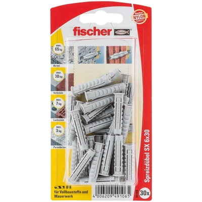 Dübel SXDer fischer Spreizdübel SX leitet durch die Vierfach-Spreizung die Kraft optimal in den Baustoff ein. Neben der typischen Spreizung garantiert das für die Herstellung verwendete hochwertige Nylon die sichere und dauerhafte Befestigung. Der am Dübelkopf angeformten Rand verhindert, dass der Dübel ins Bohrloch rutscht.